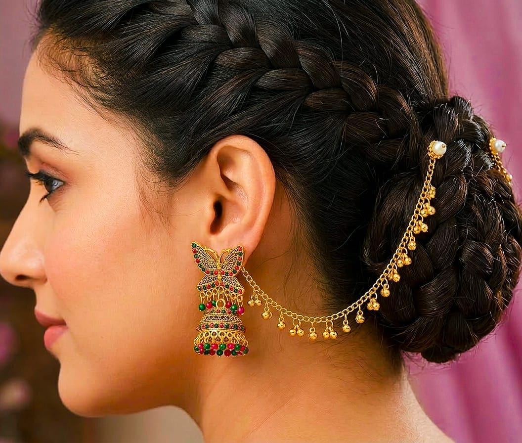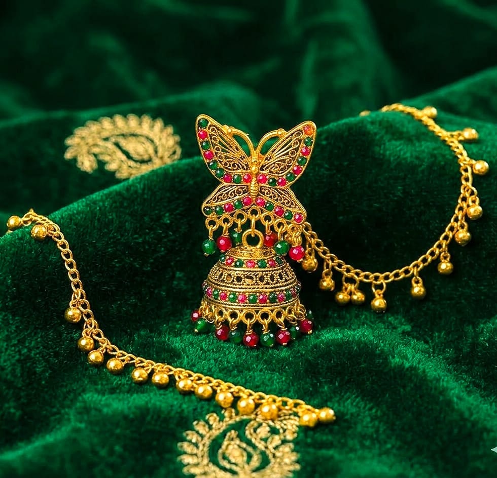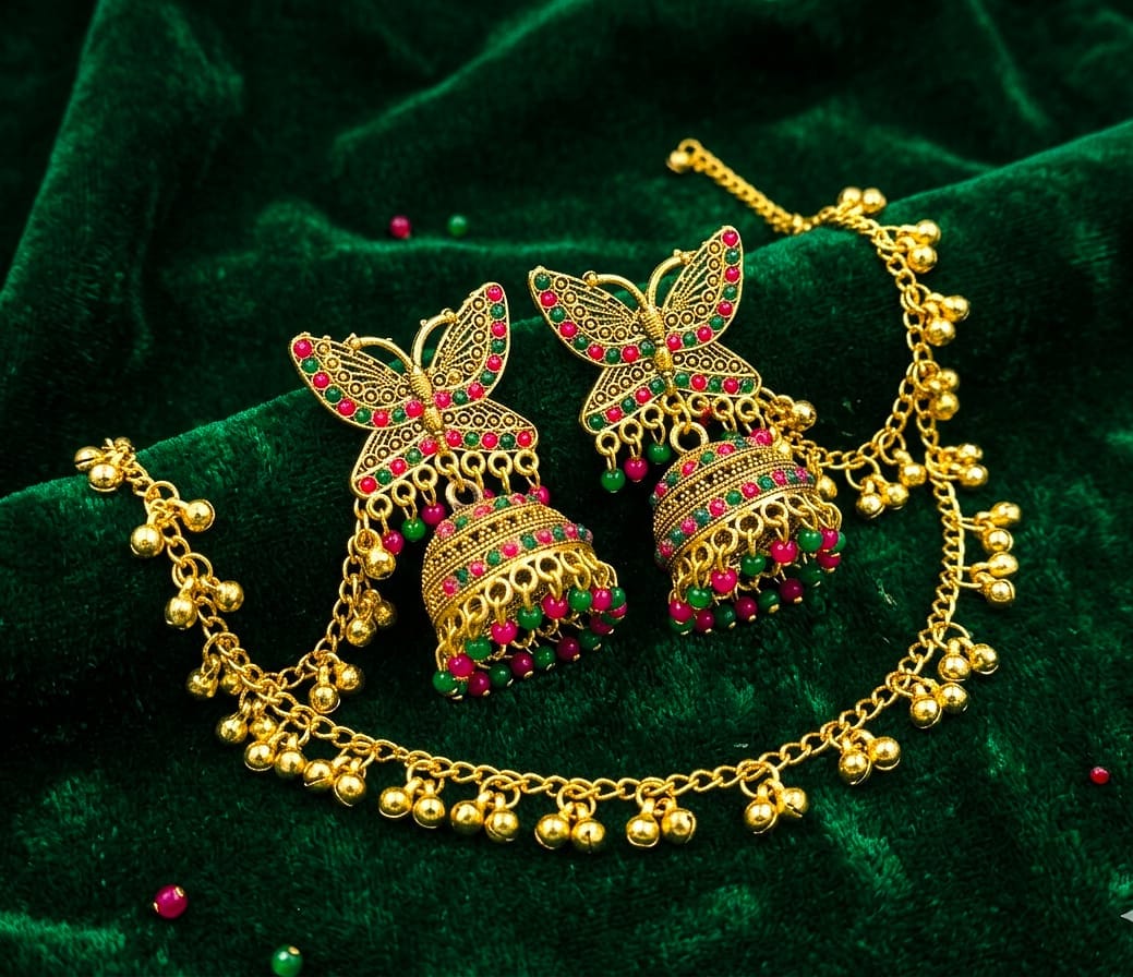Antique Gold Butterfly Jhumka Earrings with Beaded Hair Chain