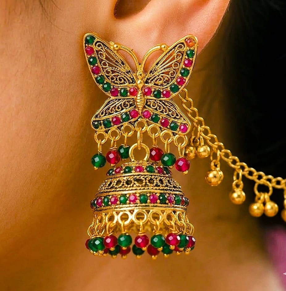 Make a graceful statement with these uniquely designed Butterfly Jhumka Earrings. This set features a stunningly detailed butterfly stud, intricately embossed with antique gold-tone filigree and accented with vibrant red and emerald-green beads.