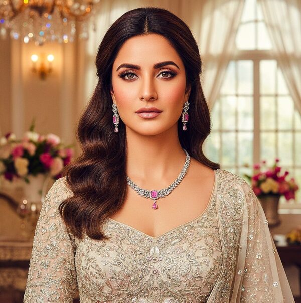For a red-carpet-ready look, pair this Luxury AD Necklace with an off-shoulder evening gown or a pastel-colored chiffon saree. The silver-tone finish works exceptionally well with cool-toned fabrics like blue, lavender, and grey. Complete your look with the matching earrings provided in the set to maintain a balanced and sophisticated aesthetic.