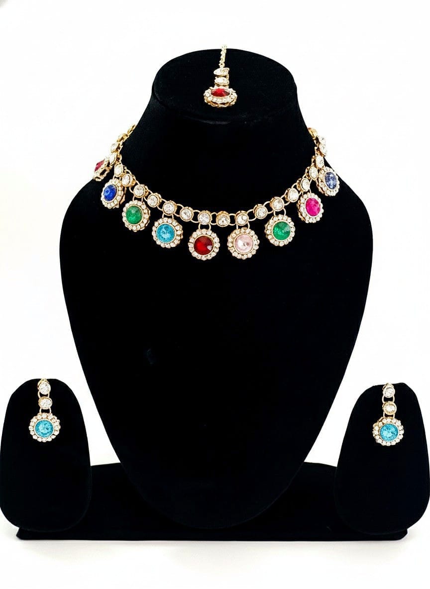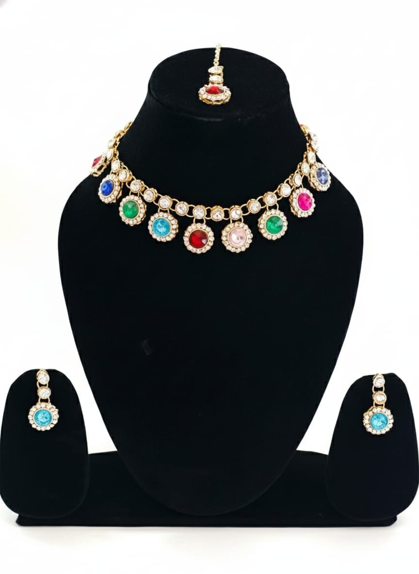 • American Diamond (AD) Studded Multi-Color Choker Set with Maang Tikka