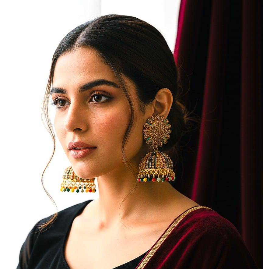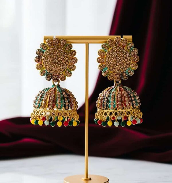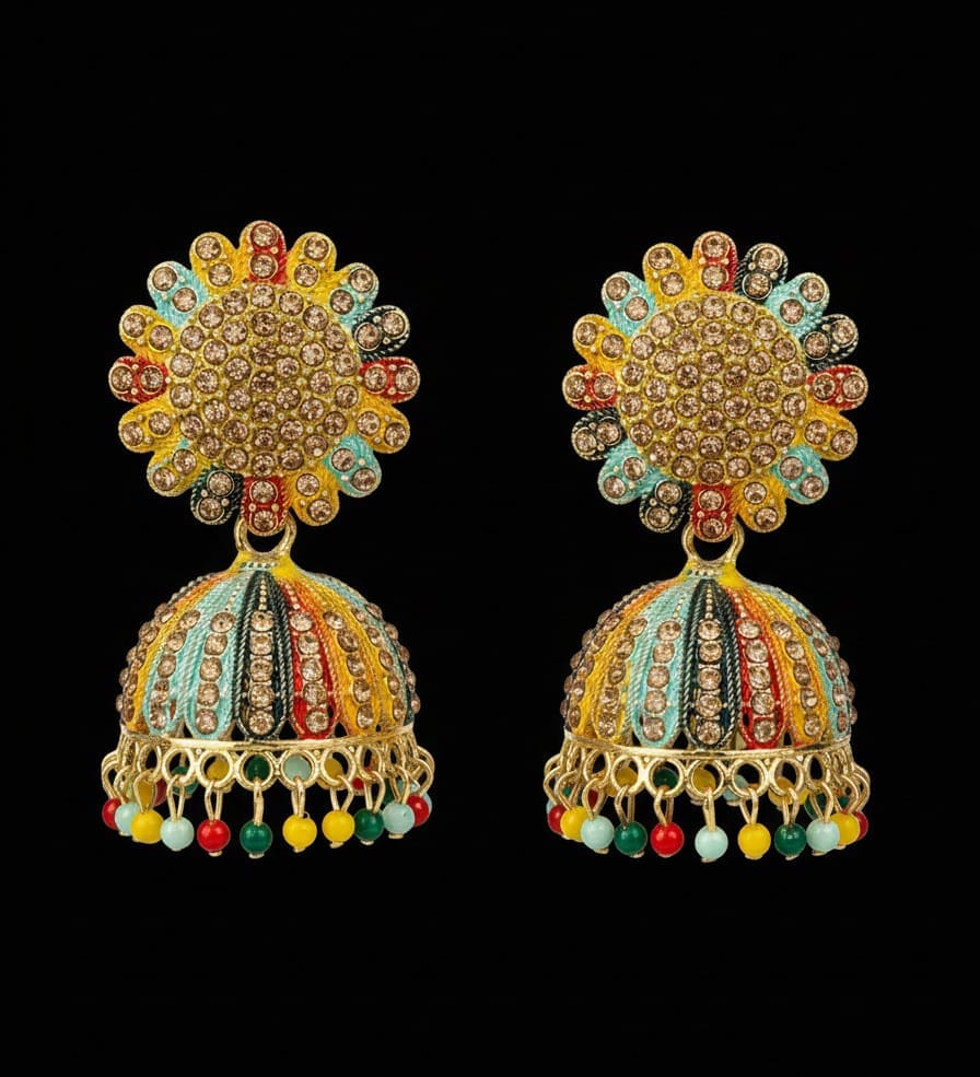 ​”Add a splash of color to your ethnic wardrobe with these stunning Multicolor Stone Jhumka Earrings. Featuring a floral stud design with vibrant enamel work and sparkling crystals, these traditional jhumkis are finished with playful colorful beads. Perfect for weddings, festivals, and special occasions. Lightweight and comfortable to wear.”
