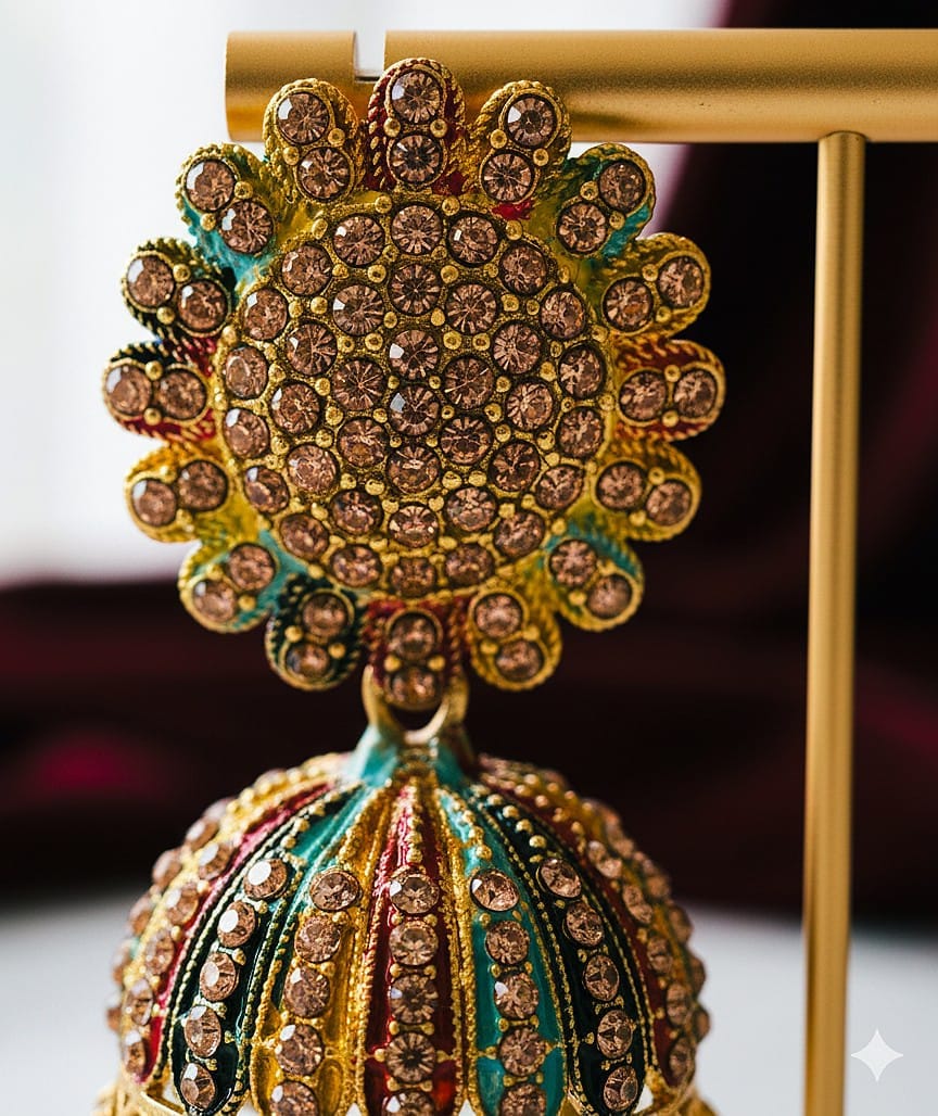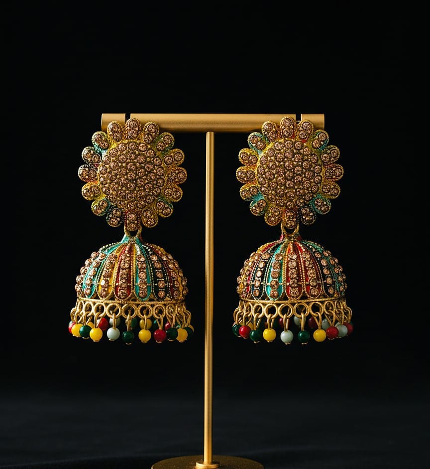 • Vibrant Mosaic Gold-Plated Jhumkas with Crystal Detailing