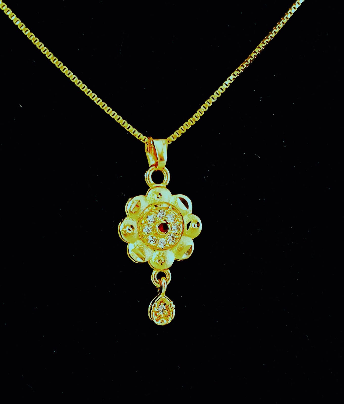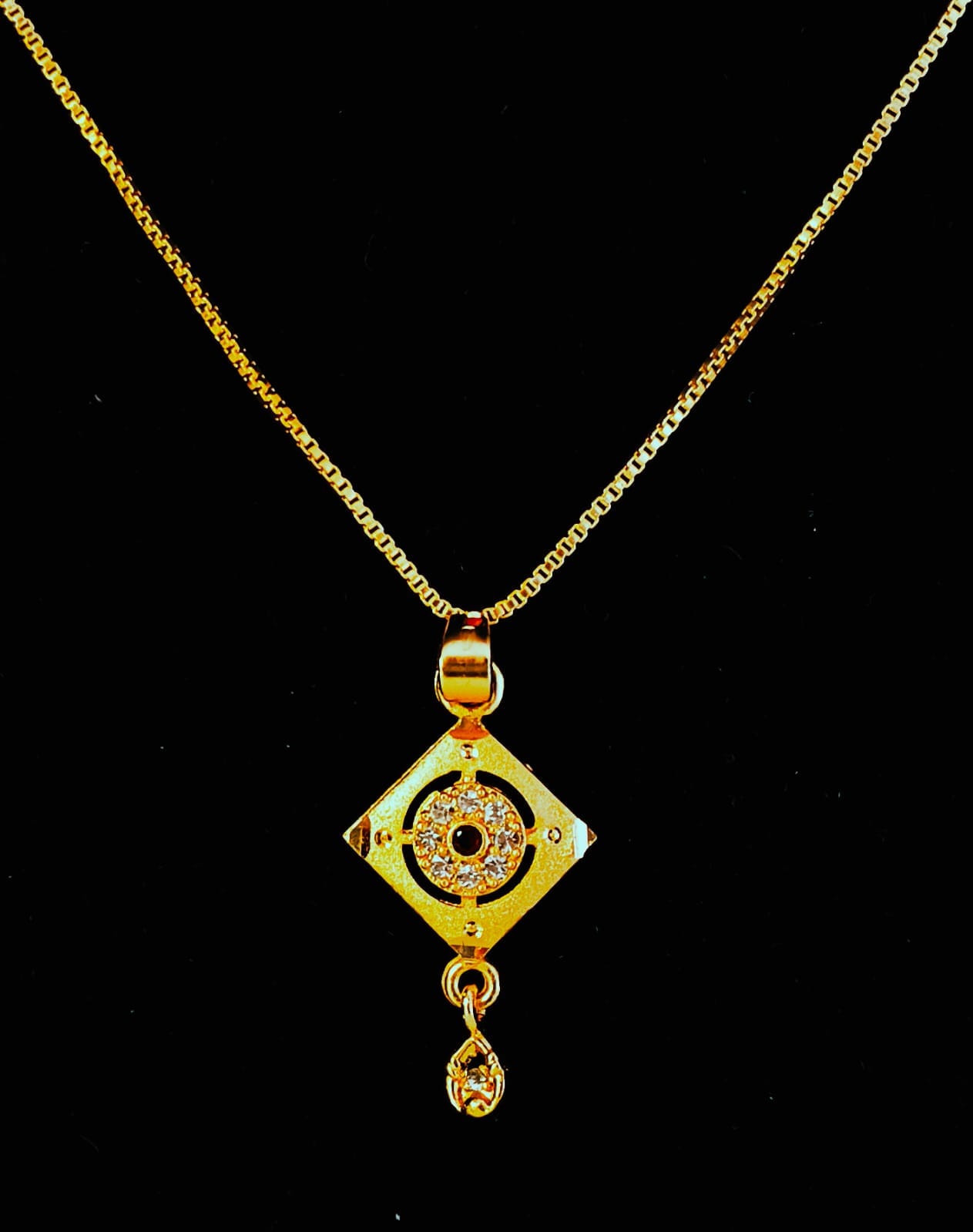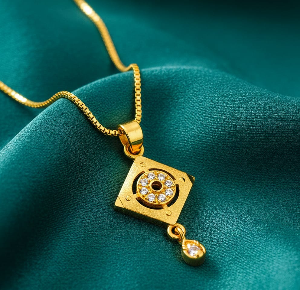 Add a touch of refined elegance to your ensemble with this stunning Gold-Plated Jewelry Set. The necklace features a fine, high-polish box chain that carries a sophisticated geometric pendant. The pendant’s unique design combines a structured diamond frame with a delicate floral motif at its center, accented by shimmering white stones for a hint of sparkle.