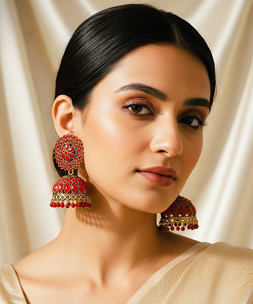 • Ethnic Crimson Red Stones Jhumki Earrings – Traditional Indian Statement Jewelry