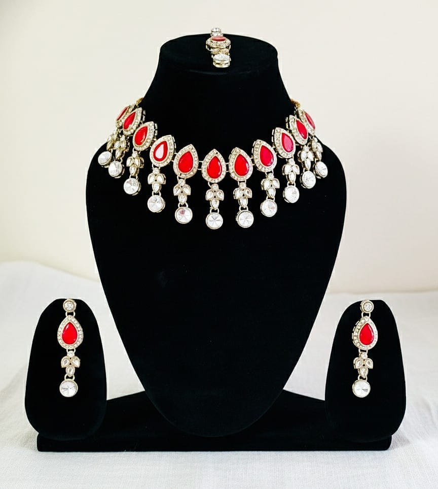 • ​Ruby Red Teardrop Choker Set with Maang Tikka