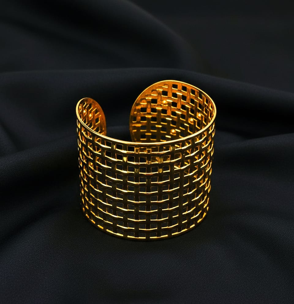 Make a sophisticated statement with the Luxora Lattice Weave Cuff. This bracelet features a magnificent basket-weave pattern, meticulously crafted to mimic the look of interwoven gold ribbons. The geometric precision of the lattice design offers a bold, modern aesthetic that commands attention while remaining classically elegant.