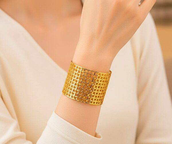 The open-work lattice design makes this cuff incredibly breathable and comfortable. It looks spectacular when paired with a sharp tailored suit for a “Power Boss” vibe, or with a simple cocktail dress to add a touch of golden texture.