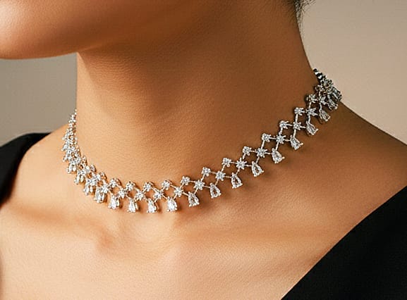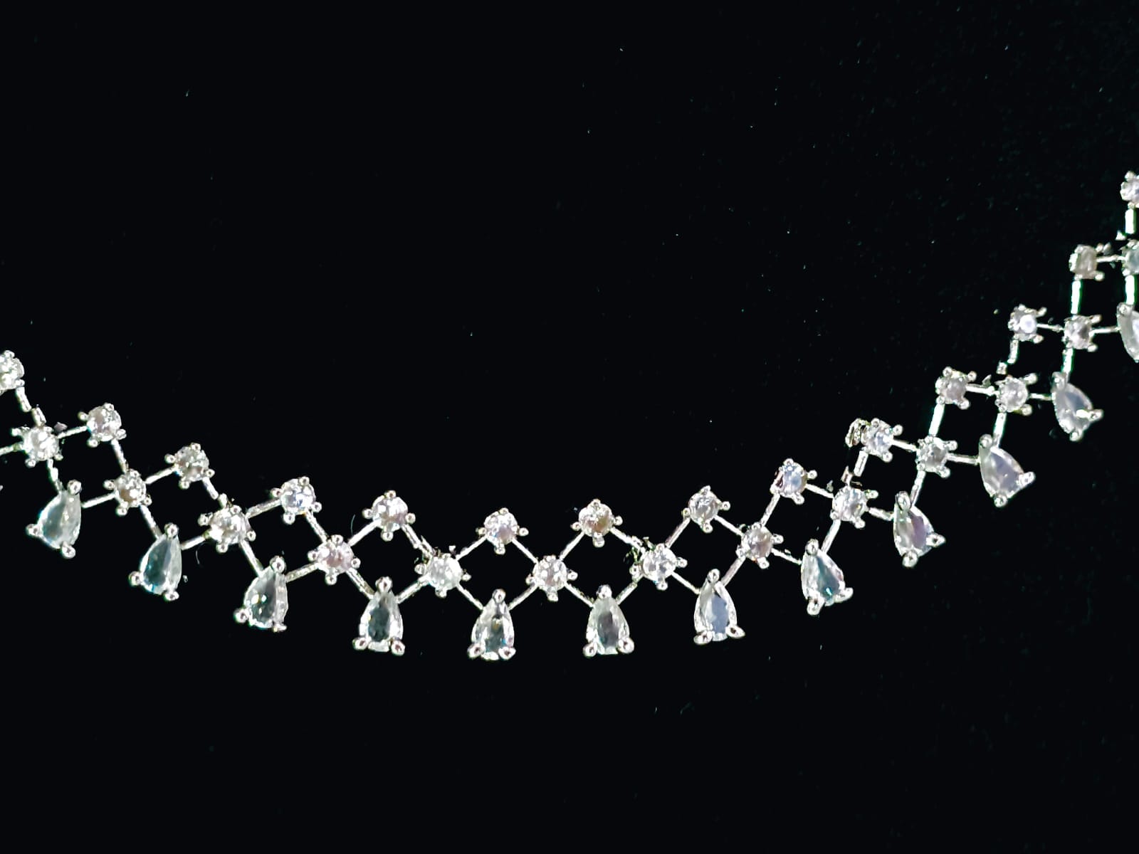 The Necklace: Features a dual-layer of brilliant-cut round stones at the intersection of every lattice point. Hanging gracefully from the lower points of the framework is a fringe of pear-cut (teardrop) stones. These drops are designed to move with you, catching and refracting light with every turn of the head.